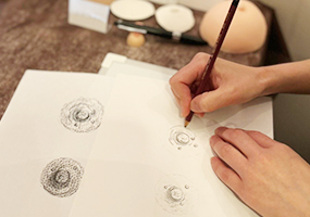 講習は主にアレオラアートメイクに必要なマシーンテクニックや技法、乳がん後の再建の基礎知識を症例から理解し、デッサン、デザイン、シート練習などアレオラアートメイクの基礎を学びます。