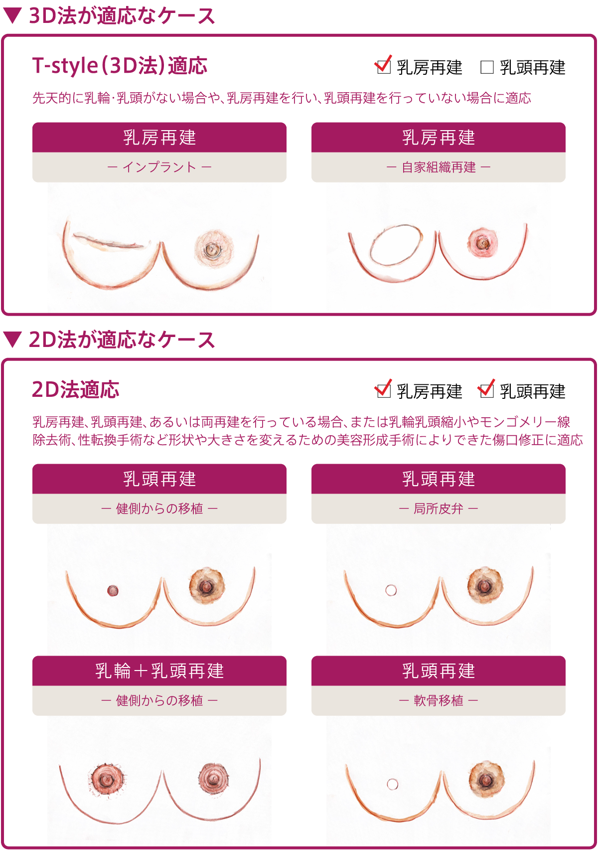 | 先天的に乳輪・乳頭がない方や、乳がんにより乳房再建手術をされた方が、医療アートメイクにて乳輪・乳頭の再建を施すこと、乳輪乳頭のカラーにコンプレックスを抱く方がカラーチェンジを行うことをアレオラアートメイクといいます。アレオラアートメイクは乳房再建におけるインプラント挿入や、自家組織再建、その後の乳頭再建、乳輪乳頭の形状や大きさを変えるため美容形成手術によりできた傷口修正(乳輪、乳頭縮小術、モンゴメリー除去術、女性から男性への乳房の変換後など)様々な術後に適応な施術で、専用の針や色素を用いて乳輪や乳頭をよりリアルに描きます。医師の指示の元、看護師が行う医療行為ですので、安心・安全に施術を受けて頂けます。 消えないアレオラアートメイク 乳がん手術後の乳房再建インプラント挿入の場合、エキスパンダーで延ばされた表皮は薄くなり色素が真皮層に到達することで(図1)タトゥーと同様の色素定着となっており、一度定着するととれにくいと言われております。 違いは歴然!本物と見間違うT-Styleだけの高いクオリティ! アンフェのアレオラアートメイクは、乳輪乳頭の再建に特化した専門技術であり、通常のアレオラアートメイク技術をさらに進化させた、よりリアルな着色を可能にする独自の「T-Style」にて施術を行っておりますので、本物と見間違うクオリティーの高い仕上がりをご提供させていただけます。 |